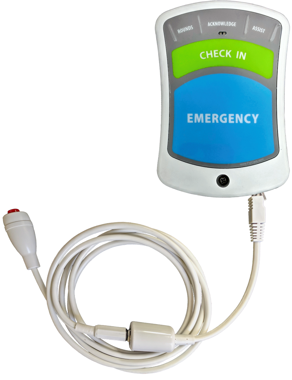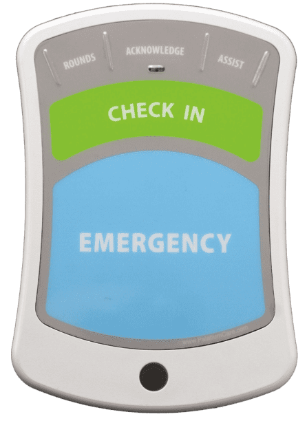 AIO stands for All-in-One. The AIO device functions as a pull cord, alert button, check-in button, rounds button, and assist button. Also available with a plug in call cord.
